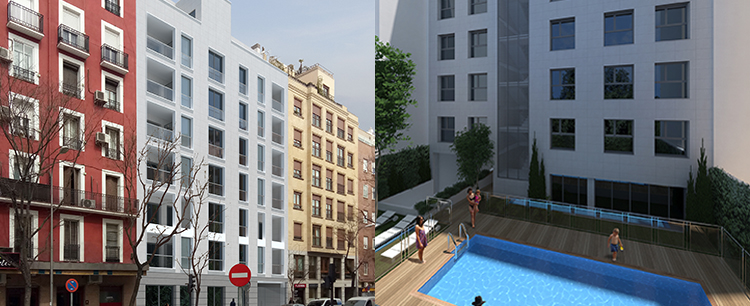 Promoción de 17 viviendas en edificio exclusivo con zonas comunes, piscina, garajes y trasteros, en Plaza Manuel Becerra, Madrid.
